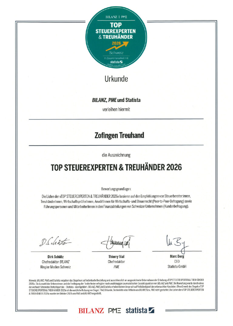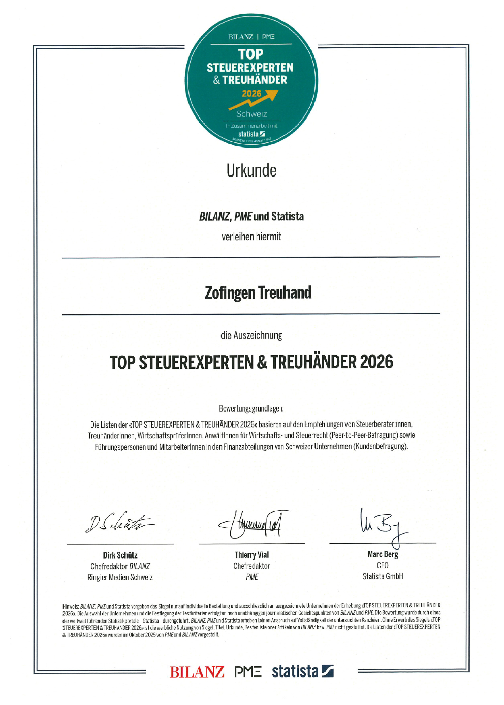 Wir sind stolz, bekannt zu geben, dass die Zofingen Treuhand AG von der Zeitschrift Bilanz erneut als einer der Top Steuerberatungs- und Treuhandgesellschaften der Schweiz 2026 ausgezeichnet wurde.